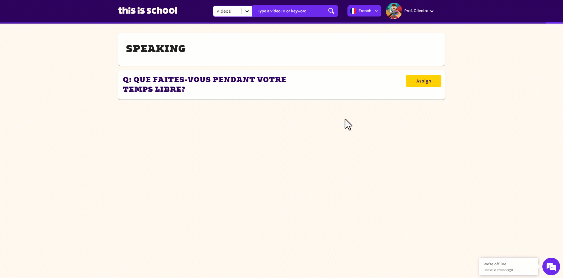 Find out how you can assign Speaking tasks here. After you’ve assigned a Speaking task on This is School, it will appear in the 'Assignments' tab of the Class in question, like this: Here, you’ll be able to see how many students have recorded their ...