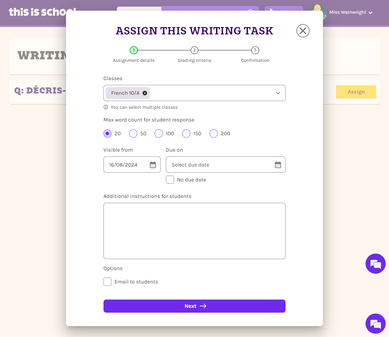 4. In the pop-up window, select the class you’d like to assign the task to, the maximum length of each student response, and the due date. Use the Notes box to add any helpful instructions for your students.