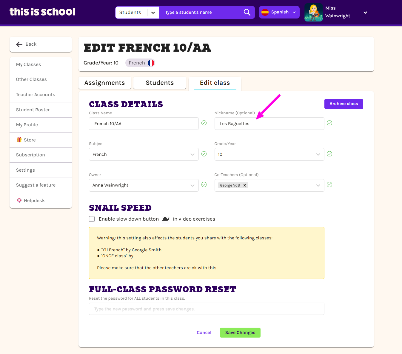 Log into your account and click on your name. Select My Classes from the drop-down menu. Click on the class whose password you want to reset and select Edit. Type a new password into the box and click Save Changes to make this the password for every ...